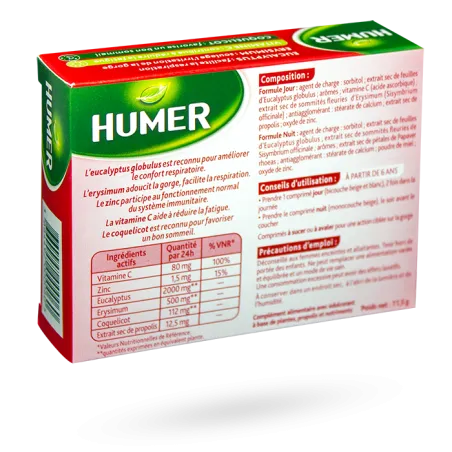 Humer jour et nuit nez/gorge contient de l'eucalyptus globulus, reconnu pour améliorer le confort respiratoire, de l'erysimum pour adoucir la gorge et faciliter la respiration.