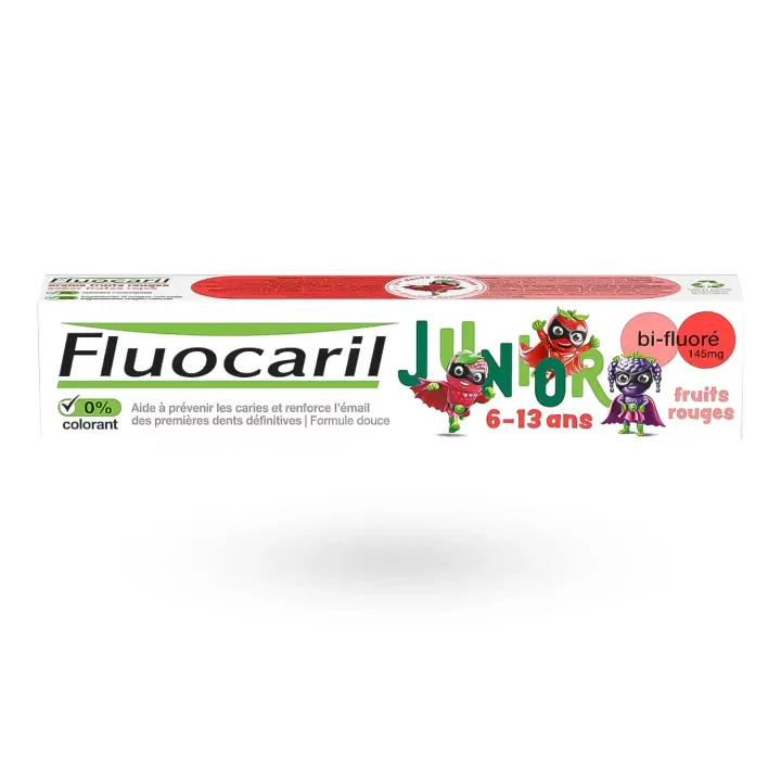 Le Fluocaril Junior dentifrice bi-fluoré 145 mg 6-13 ans goût fruits rouges est spécialement conçu pour accompagner les enfants durant la période clé de transition entre dents de lait et premières dents définitives.