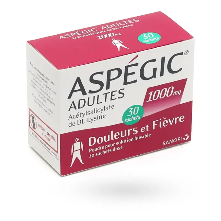 Aspégic Adultes 1000 mg en boîte de 30 sachets est une solution à base d’aspirine (acide acétylsalicylique) destinée à l’adulte et à l’adolescent à partir de 15 ans, généralement dès 50 kg.