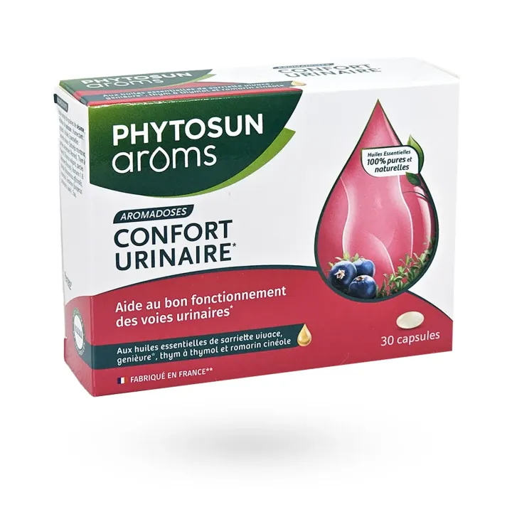 Les Aromadoses Confort Urinaire Phytosun arôms 30 capsules sont un complément alimentaire à base d’huiles essentielles destiné à aider au bon fonctionnement des voies urinaires chez l’adulte.
