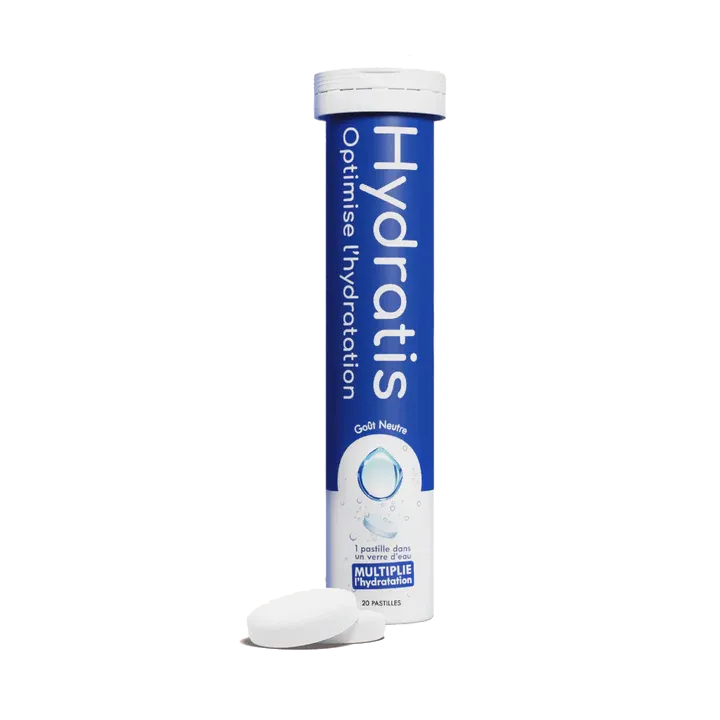 Hydratis Goût Neutre est un complément d’hydratation sous forme de pastilles effervescentes enrichies en électrolytes.
