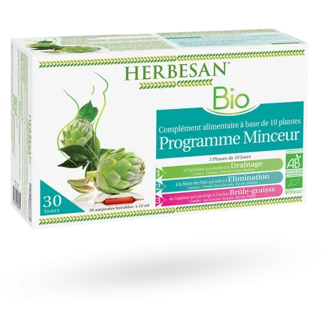 Ce programme minceur BIO à base de 10 plantes des laboratoires Herbesan permet de favoriser le drainage, aider à l'élimination et participer à l'action brûle-graisse.