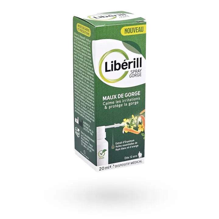 Libérill spray gorge maux de gorge 20 ml est un dispositif médical spécifiquement formulé pour calmer les irritations, protéger la muqueuse oropharyngée et apaiser les douleurs de gorge, à partir de 12 ans.