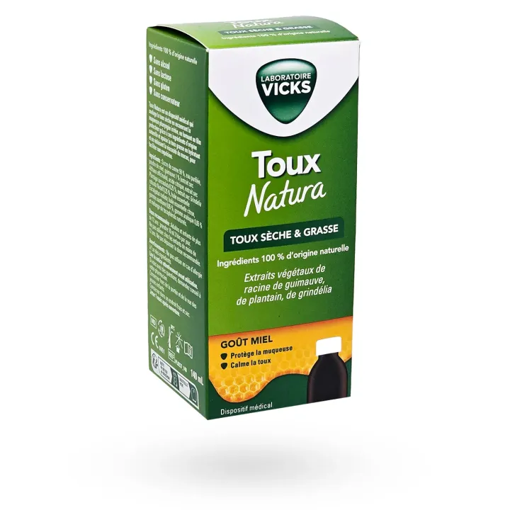 Vicks Toux Natura sirop toux sèche & grasse goût miel est un dispositif médical naturel qui apaise la toux sèche et facilite l’élimination du mucus en cas de toux grasse.