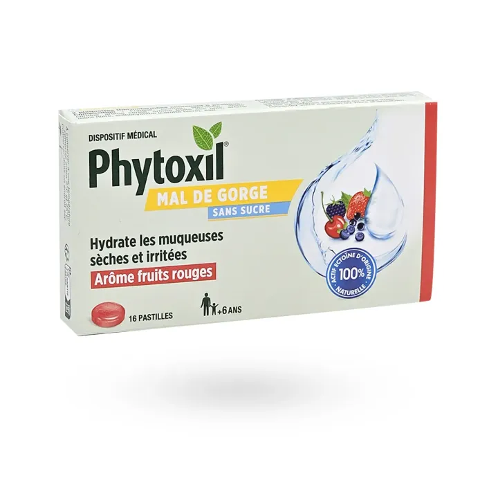 Les pastilles Phytoxil Mal de gorge fruits rouges sans sucre sont un dispositif médical destiné à hydrater, protéger et apaiser les muqueuses sèches et irritées de la gorge dès l’âge de 6 ans.