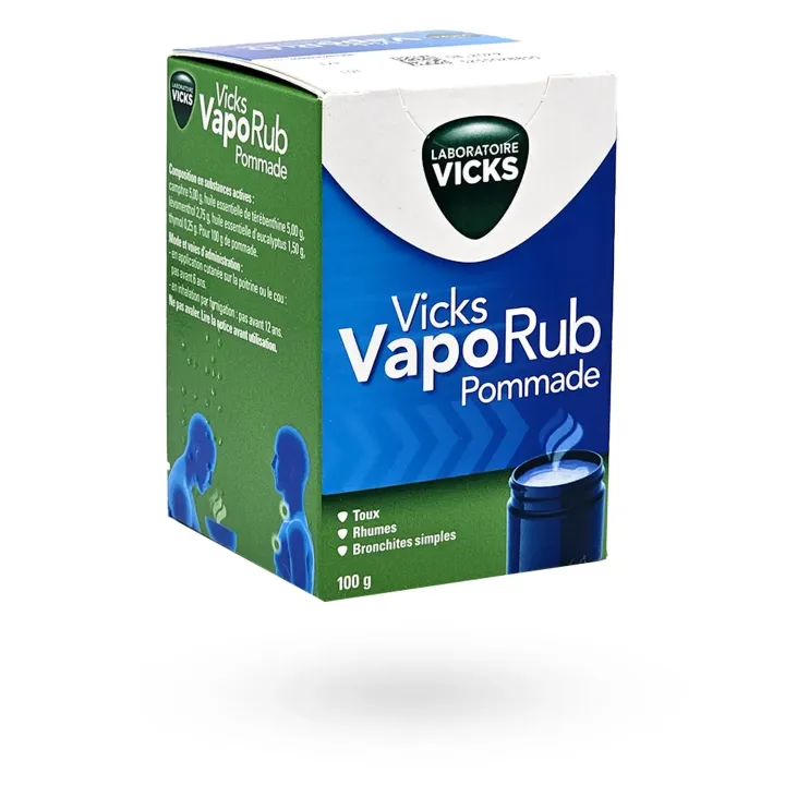 Vicks VapoRub pommade pot de 100 g est un médicament décongestionnant d’appoint indiqué dans les affections respiratoires banales : rhume, toux, bronchite simple, sensation de nez pris et gêne respiratoire liée à l’encombrement ORL.