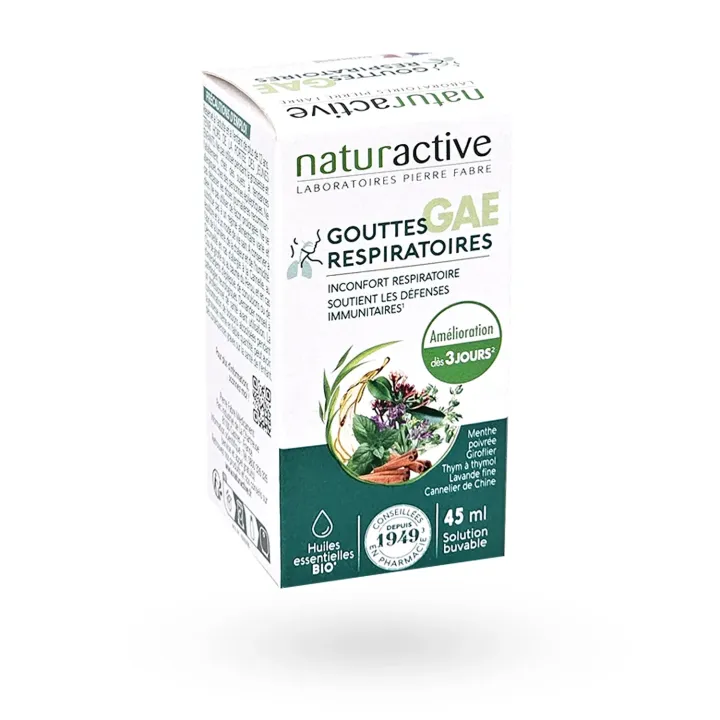 Les Naturactive Gouttes aux Essences (GAE) solution buvable 45 ml sont un médicament traditionnel à base de plantes et d’huiles essentielles utilisé pour soulager les affections bronchiques aiguës bénignes.