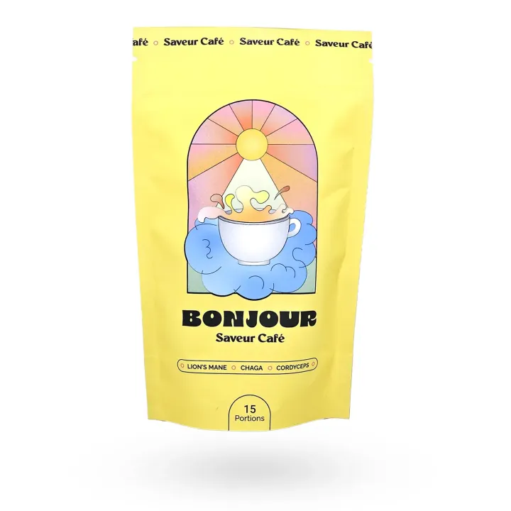 Bonjour Saveur Café est un complément alimentaire à base de champignons présenté en sachet de 90 g.