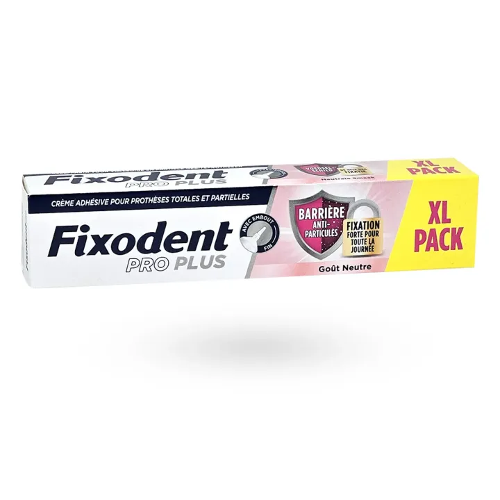 Fixodent PRO Plus Barrière Anti-Particules XL Pack est une crème adhésive pour prothèses dentaires complètes et partielles offrant fixation longue durée, protection maximale contre les résidus alimentaires et confort optimal.
