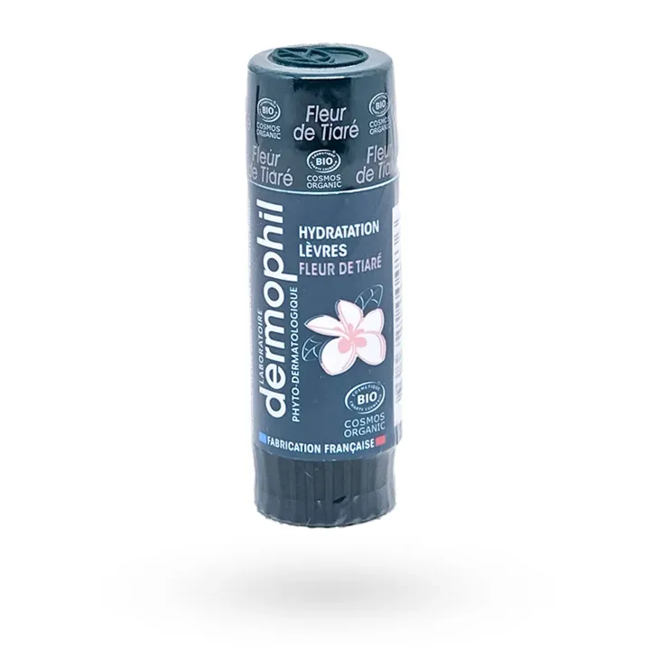 Le Stick lèvres Dermophil Hydratation Fleur de Tiaré BIO 4 g hydrate, nourrit et protège les lèvres au quotidien tout en laissant un goût délicat et apaisant de fleur de tiaré.
